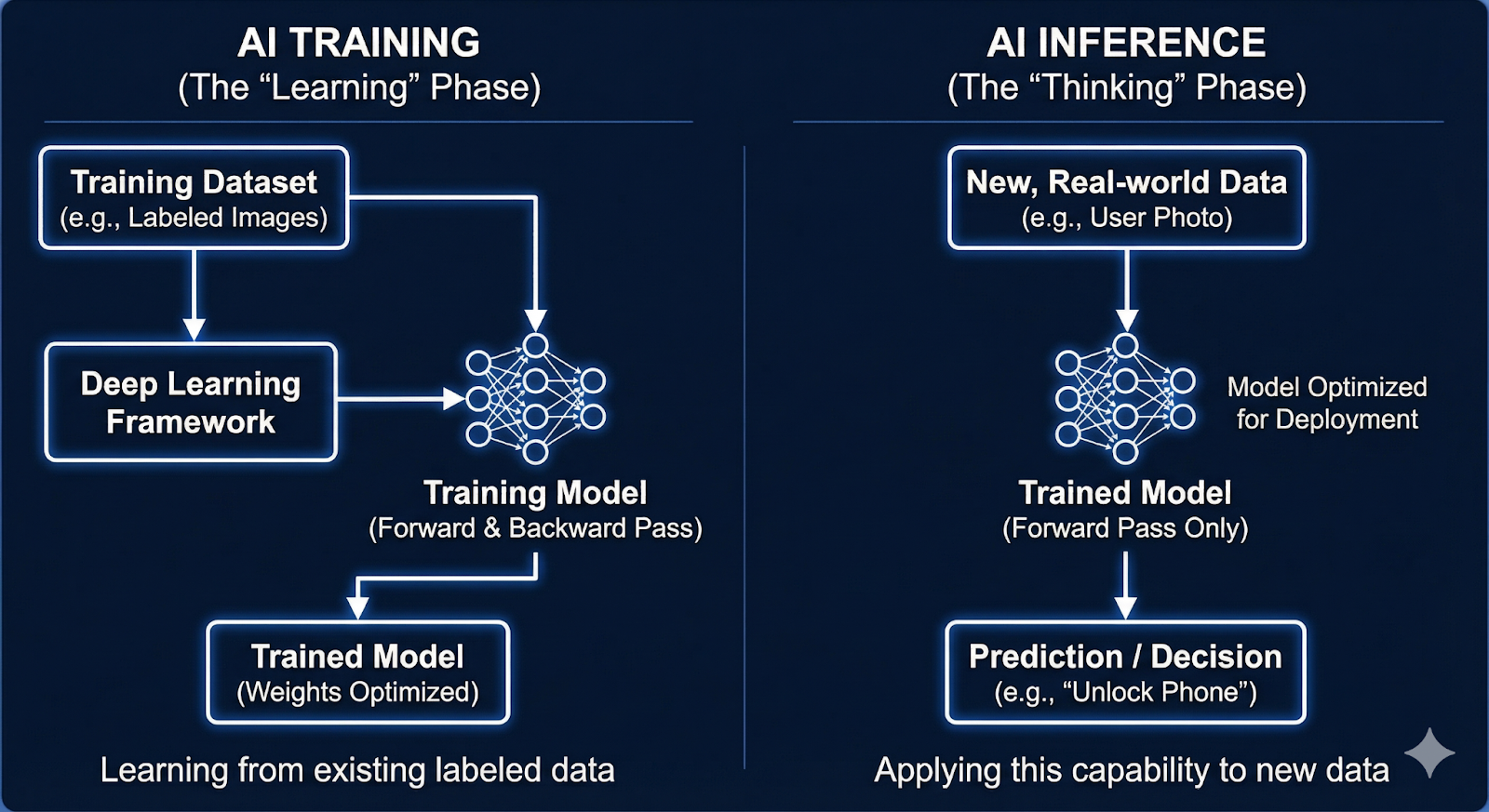 Inference is the "Action Phase." It is the application of that brain to the real world. When your phone recognizes your face, it is performing inference using a model that was previously trained.
